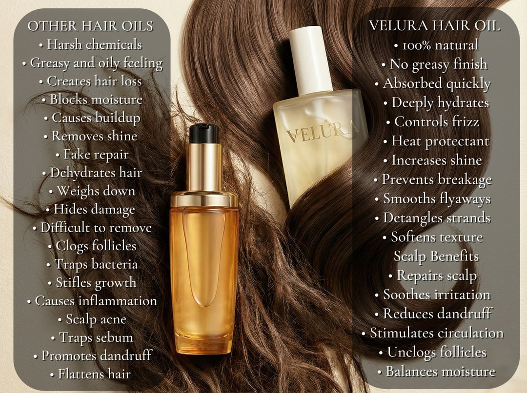 Unlike the synthetic hair oils on the market that create these issues, Velura is crafted with 11 natural ingredients to help fix your hair and scalp.